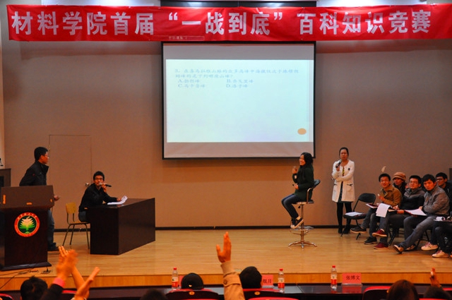 比赛分为海选、复赛、车轮战和巅峰对决四个环节,涵盖专业知识、文学、地理、数理化、生活常识等各个领域。海选环节由全场同学参与,大家绷紧神经认真听题,斟酌着亮出自己的答案;复赛环节选手们发挥才智,快速有效的写下答案;车轮战紧张气氛剧增,五位选手轮番答题,显示了选手们渊博的知识积累;巅峰对决将比赛推向了高潮,两位选手棋逢对手,难分伯仲,比分相持不下,观众们也随之紧张。比赛还设置了观众抽奖答题环节,同学们都跃跃欲试,气氛热烈。狭路相逢勇者胜,台上选手们尽情地展现他们渊博的学识和丰富的阅历,台下观众们也积极参与,台上台下都充斥着紧张激烈的氛围。